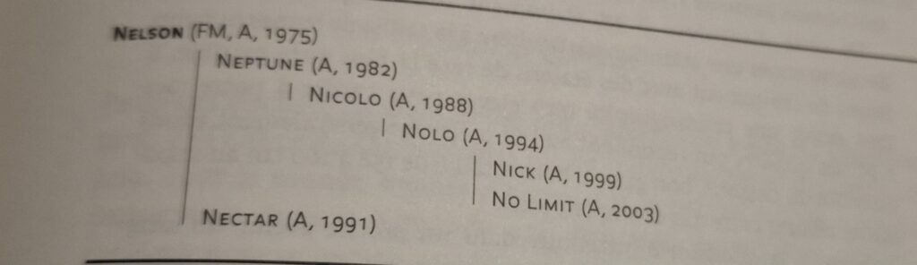 Nelson zal een 20-tal Elite-merries voortbrengen. Zijn mannelijke nazaten kunnen de fokkers niet meteen boeien. Dankzij Joseph Chêne uit Damvent, kreeg zijn stamlijn toch nog succes met Neptune (°1982), Nolo (°1994) en diens zonen Nick (° 1999) en NO LIMIT (°2003)