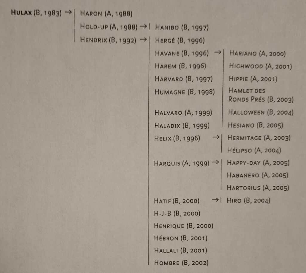 Waarschijnlijk komen er tal van zijn nazaten al eens voor op je paspoort(en) want zoals je kan zien in bovenstaand schema van de nazaten van HULAX, komen we stilaan naar de meer recentere hengsten toe zoals jullie kunnen merken aan de geboortedata.
